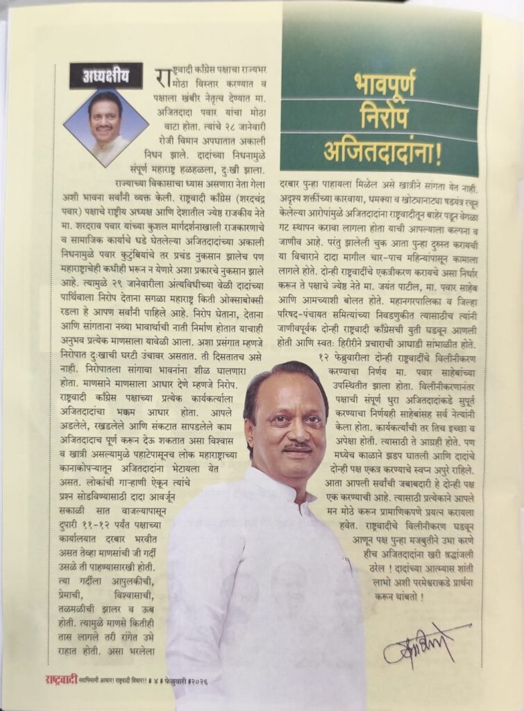 राष्ट्रवादी काँग्रेसचे ज्येष्ठ नेते शशिकांत शिंदे यांनी साप्ताहिकातील आपल्या ‘अध्यक्षीय मनोगतातून’ दिवंगत नेते अजितदादा पवार यांना अत्यंत भावपूर्ण शब्दांत श्रद्धांजली अर्पण केली आहे. अजितदादांच्या अकाली निधनामुळे निर्माण झालेली पोकळी ही केवळ पवार कुटुंबाची किंवा एका पक्षाची नसून, ती संपूर्ण महाराष्ट्राची कधीही भरून न येणारी हानी असल्याचे शिंदे यांनी नमूद केले. या मनोगतात त्यांनी दादांच्या कार्यपद्धतीवर प्रकाश टाकतानाच, दोन्ही राष्ट्रवादी काँग्रेसच्या विलीनीकरणाबाबतच्या महत्त्वाच्या घडामोडींचा उलगडा केला आहे.