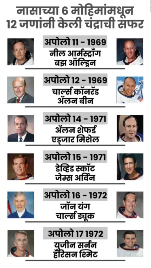 नासाने १९६९ ते १९७२ या कालावधीत एकूण सहा यशस्वी अपोलो मोहिमा राबवल्या, ज्यांतून हे १२ अंतराळवीर चंद्रावर उतरण्यात यशस्वी झाले. या मोहिमांना अपोलो 11 ते अपोलो 17 असे नामकरण करण्यात आले, ज्या सात मोहिमांपैकी अपोलो 13 अपयशी ठरली होती. या मोहिमांमध्ये एकूण २४ अंतराळवीर सहभागी झाले, परंतु फक्त १२ जणच प्रत्यक्ष चंद्रावर उतरले. चंद्रावर उतरणाऱ्या या अंतराळवीरांनी केवळ चंद्रावर पाऊल टाकले नाही, तर माती आणि खडकांचे नमुनेही गोळा केले, जे आजही जगभरातील प्रयोगशाळांमध्ये वैज्ञानिक अभ्यासासाठी वापरले जात आहेत. यामुळे चंद्राच्या रचनात्मक वैशिष्ट्यांचा, भूगर्भशास्त्राचा आणि ऐतिहासिक भू-वैज्ञानिक प्रक्रियेचा अभ्यास करता येतो.