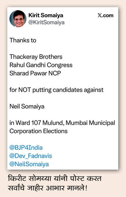 Kirit Somaiya – महापालिका निवडणुकांच्या निमित्ताने राजकारण्यांचा हिडीस चेहरा अख्ख्या महाराष्ट्राने पाहिला. सत्तेसाठी वाट्टेल तशा आघाड्या-युतीमधून राजकारण्यांच्या दुटप्पीपणाचे दर्शन घडले. असाच एक प्रकार मुंबईत घडला आहे. उबाठावर सातत्याने जहरी टीका करणारे भाजपा नेते किरीट सोमय्या यांच्या मुलाचा विजय सोपा व्हावा म्हणून उबाठा आणि मनसे यांनी त्याच्या विरोधात उमेदवारच दिला नाही. किरीट सोमय्यांचे ( Kirit Somaiya) पुत्र माजी नगरसेवक नील सोमय्या मुलुंडच्या प्रभाग क्रमांक 107 मधून भाजपाच्या तिकिटावर निवडणूक लढवत आहेत. त्यांच्या विरोधात उबाठाने तगडा उमेदवार देणे अपेक्षित होते. पण प्रत्यक्षात उबाठा-मनसे युतीने या प्रभागात उमेदवारच दिला नाही. येथे शरद पवारांच्या राष्ट्रवादी काँग्रेसच्या उमेदवाराचा अर्जही बाद झाला. तर काँग्रेस-वंचित बहुजन आघाडीच्या जागावाटपात काँग्रेसने ही जागा वंचितसाठी सोडली. वंचितने वैशाली सकपाळ यांना उमेदवारी दिली. त्यामुळे आता नील सोमय्या यांचा सामना वैशाली सकपाळ आणि अन्य अपक्ष उमेदवारांशी आहे. त्यामुळे नील सोमय्या यांचा विजय सहज मानला जात आहे. या प्रभागातून 2017 साली नील सोमय्या निवडून आले होते. म्हणजे आता त्यांच्यासमोर आपली ही जागा राखणे एवढेच माफक आव्हान आहे.