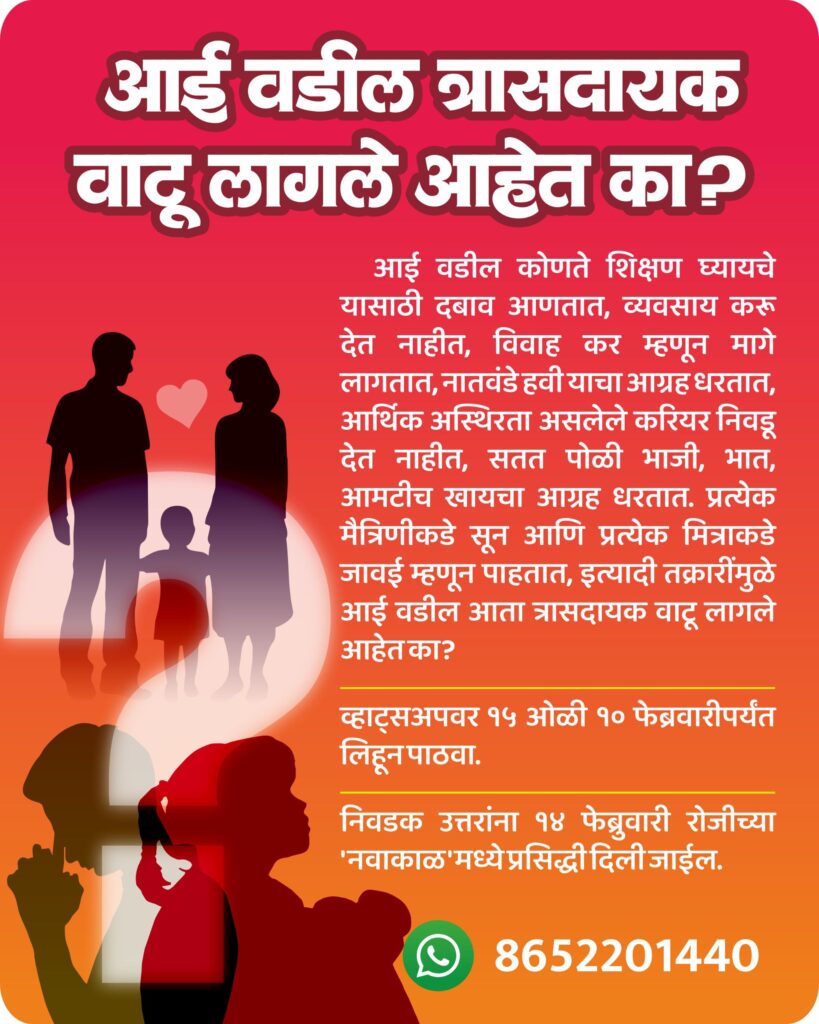 Navakal Valentine Day Special : आई वडील त्रासदायक वाटू लागले आहेत का? यावर तुमचं मत काय? खाली दिलेल्या नंबरवर तुमचे मत कळवा..तुमची निवडक मते ‘नवाकाळ पेपर तसेच नवाकाळ डिजिटलवर नावासहित’ प्रसिद्ध होतील…