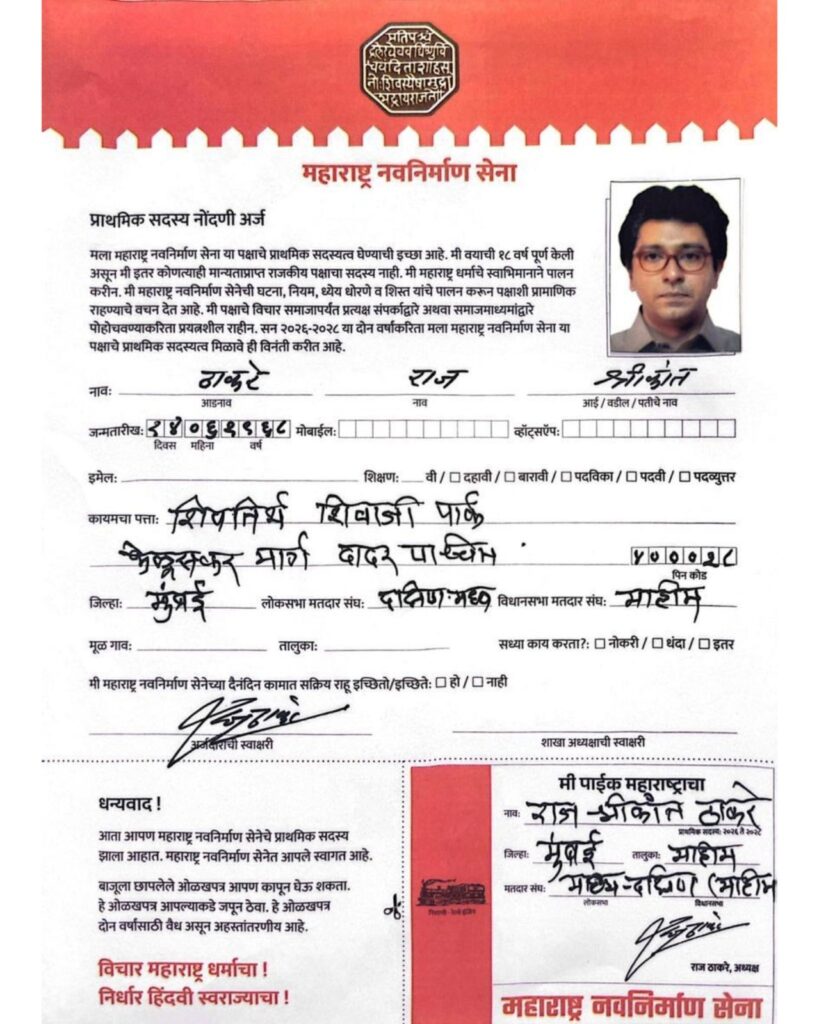 उद्यापासून सुरू होणाऱ्या सदस्य नोंदणी मोहिमेचे महत्त्व विशद करताना राज ठाकरे म्हणाले की, “या मोहिमेत सहभागी होताना तुमची राजकीय विचारधारा, तुमची जात किंवा तुमचा धर्म यापेक्षाही महत्त्वाचे हे आहे की, तुम्ही आमच्यासारखेच ‘महाराष्ट्र वेडाने’ झपाटलेले आहात. तुम्ही केवळ पक्षाचे सदस्य होणार नाही, तर खऱ्या अर्थाने ‘महाराष्ट्राचे पाईक’ होणार आहात.” ज्यांना सक्रिय राजकारणात रस आहे, त्यांच्यासाठी सदस्य नोंदणी अर्जामध्ये ‘सक्रिय सभासद’ होण्याचा विशेष पर्यायही देण्यात आला आहे. या पर्यायाची निवड करणाऱ्या तरुणांशी पक्षाचे वरिष्ठ पदाधिकारी स्वतः संपर्क साधणार असल्याचे त्यांनी स्पष्ट केले.