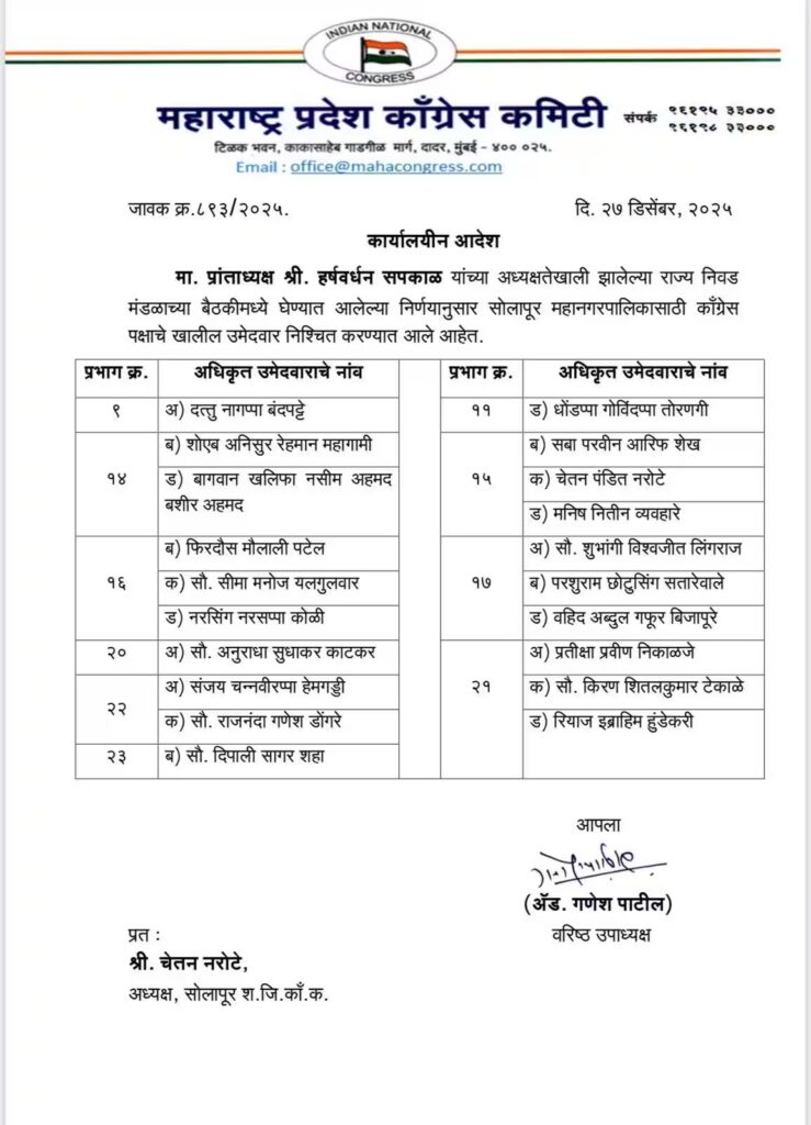 शहराध्यक्ष चेतन नरोटे यांच्यासह २० जणांना काँग्रेसने उमेदवारी दिल्याचे समोर आले आहे. यामध्ये माजी आमदार प्रकाश यलगुलवार यांच्या सून सीमा यलगुलवार, माजी महापौर आरिफ शेख यांच्या कन्या सबा परवीन शेख, माजी महापौर संजय हेमगड्डी यांना देखील उमेदवारी जाहीर करण्यात आली असल्याचे समोर आले आहे.