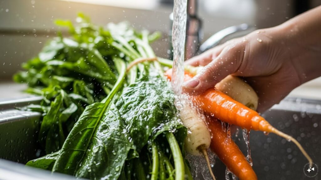 सर्वात सोपी आणि तात्काळ उपलब्ध असलेली पद्धत म्हणजे भाज्या वाहत्या नळाखाली किमान २० ते ३० सेकंद स्वच्छ धुणे. पाण्याच्या प्रवाहामुळे भाजीवरील माती, धूळ आणि पृष्ठभागावर साचलेली काही रसायने यांत्रिक क्रियेद्वारे निघून जातात.