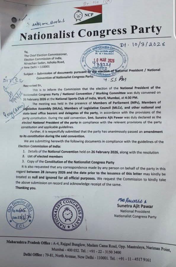 सुनेत्रा पवार यांनी आयोगाला पाठवलेल्या पत्रात अधिवेशनाचा तपशील, ठराव, निवडून आलेल्या सदस्यांची यादी तसेच पक्षाच्या घटनेची प्रत सादर केली आहे. यासोबतच पक्षाच्या घटनेत करण्यात आलेल्या दुरुस्तीची माहितीही आयोगाला दिली.