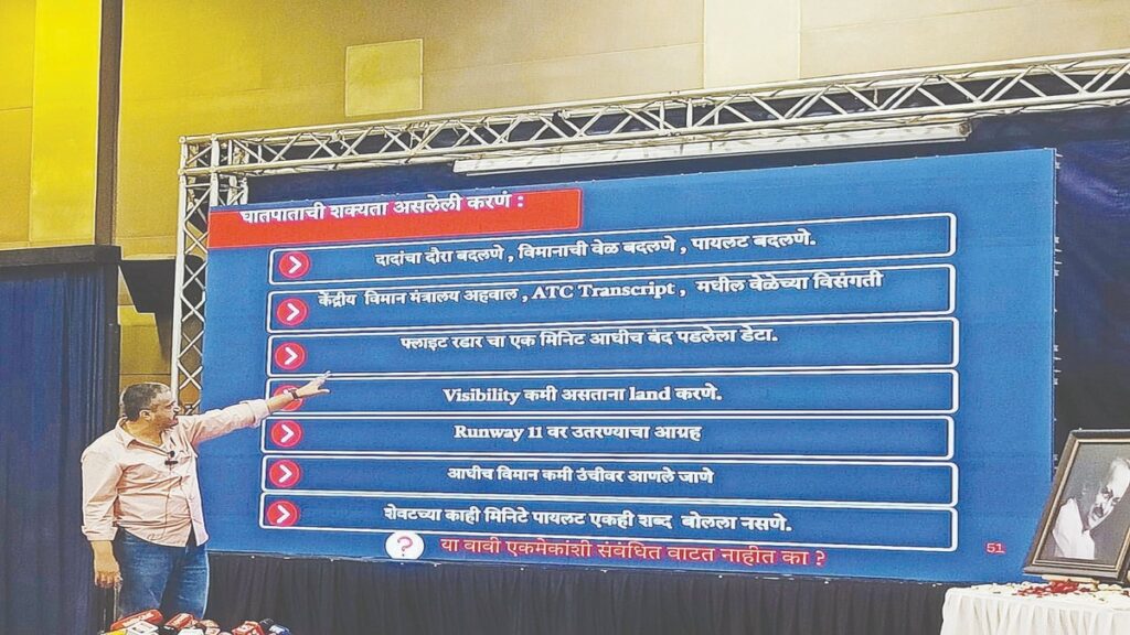 विमान उडाले आणि घिरटी घातल्यावर वैमानिकाने तिसरी घिरटी न घेता दुसर्‍या घिरटीत उतरवले. दादांना बारामतीला सोडून ते विमान पाटण्याला जायचे होते. त्याचे 10 लाख बुडू नयेत म्हणून उतरवायचा दबाव वैमानिकावर आणला का? विमानातील टॉकीवरून ते बोलतात ते समजते, पण ती पीटीटी सिस्टिम बंद होती. विमान जमिनीजवळ अधिक आले तर इशारा देते की, जमीन जवळ आली, पण हा इशारा ऐकू आला नाही. ही कंपनी स्वतःच स्वतःच्या विमानांची देखरेख करायची, हे तज्ज्ञ आहेत का? रमेश हा त्या विभागाचा प्रमुख आहे त्याची चौकशी का केली नाही?