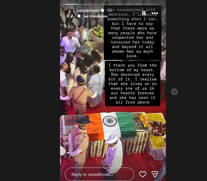 अंत्यसंस्काराचा विधी पार पडल्यानंतर, जनाईने आपल्या भावनांना वाट करून देण्यासाठी इंस्टाग्रामचा आधार घेतला. तिने आपल्या आजीसोबतचा एक जुना, अत्यंत जिव्हाळ्याचा फोटो आणि अंत्यसंस्काराच्या वेळचे काही क्षण ‘स्टोरी’च्या माध्यमातून चाहत्यांशी शेअर केले. आपल्या भावना व्यक्त करताना तिने अत्यंत हृदयस्पर्शी शब्दांत लिहिले की, “सध्या माझ्या मनाची स्थिती शब्दांत मांडणे अशक्य आहे. ही वेळ माझ्यासाठी अत्यंत कठीण असून, जेव्हा मन शांत होईल तेव्हा मी नक्कीच काहीतरी लिहीन. परंतु, सध्या मला केवळ इतकेच सांगायचे आहे की, माझ्या आजीला समाजातील प्रत्येक स्तराकडून मिळालेले प्रेम आणि आदर पाहून मी भारावून गेले आहे.” तिने पुढे कृतज्ञता व्यक्त करताना म्हटले की, “आशाताई खरोखरच या अलोट प्रेमास पात्र होत्या आणि मला विश्वास आहे की, त्या आपल्या सर्वांच्या स्मरणात सदैव जिवंत राहतील. त्यांनी हे सर्व प्रेम स्वर्गातून नक्कीच पाहिले असेल.”
